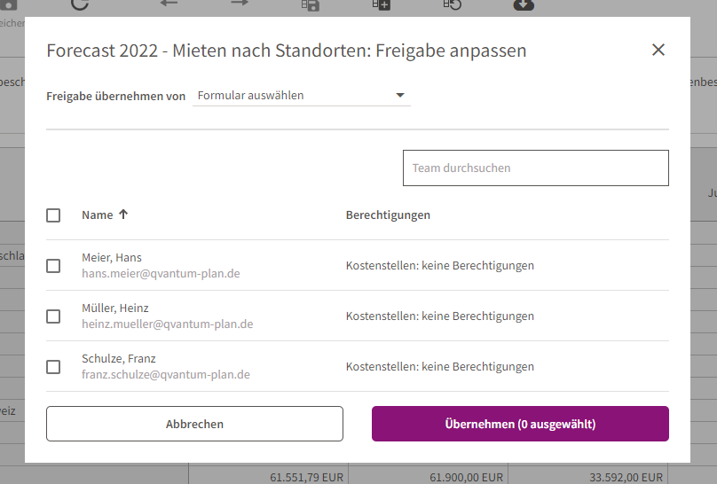 Bei der Wahl des Feldes „Für bestimmte Team-Mitglieder“ erscheint ein Dialog, bei dem man jeweils einen Haken bei den Team-Mitgliedern setzen kann, die die Berechtigung der Einsicht erhalten sollen. Über das Dropdown-Menü am oberen Rand des Dialogs kann man die Freigabe-Reglungen eines anderen, bereits bestehenden Formulars übernehmen, das nicht „Nur für Owner“ oder „Für das gesamte Team“ freigegeben sind.