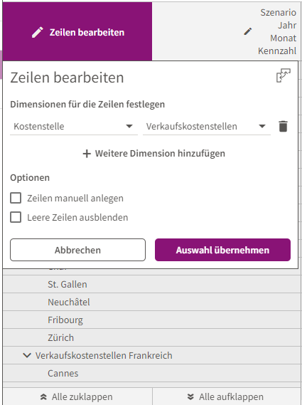 Durch einen Klick auf die Schaltfläche „Zeile bearbeiten“ öffnet sich ein Feld, dass die Bearbeitung und Anpassung der Zeilen erlaubt. Setzt man ein Häkchen in der Checkbox „Leere Zeilen ausblenden“ blendet QVANTUM alle Zeilen die leer sind oder Null Werte haben aus.