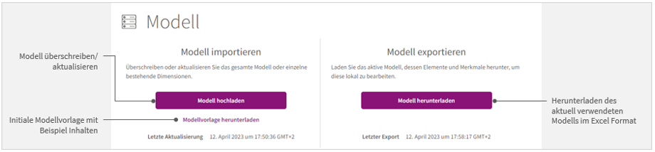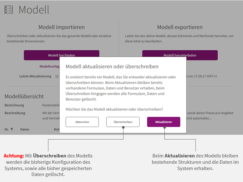 * **Modell importieren** Mit dem Import können Sie das aktuell hinterlegte Modell überschreiben oder aktualisieren.